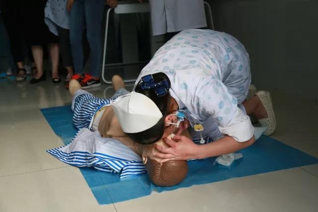 讲课结束后,护士刘娟在模拟人上演练了心肺复苏术。为了让该公司员工掌握心肺复苏术,在医生、护士指导下,该公司员工现学现做,在模拟人体上演练心肺复苏术。